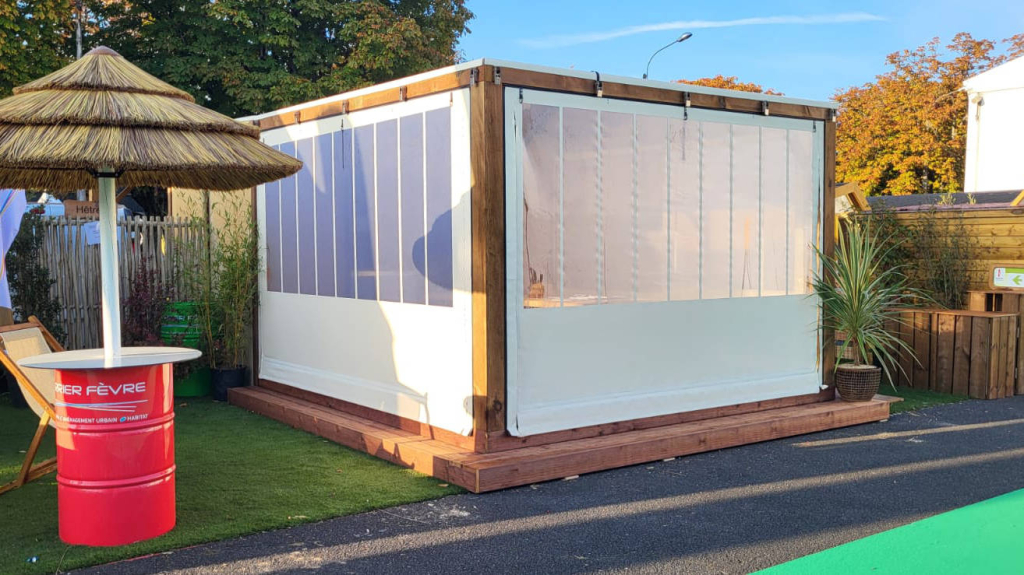 DuoCamp® est entièrement couvert avec une toile PVC étanche. Les pergolas peuvent être équipées de fermetures latérales transparentes pour une protection vent et pluie.