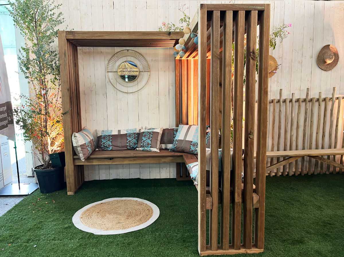 La pergola Odyssée mélange l’originalité avec l’utilisation de l’eucalyptus et le confort avec sa toile imperméable qui laisse passer la lumière naturelle sans éblouissement.